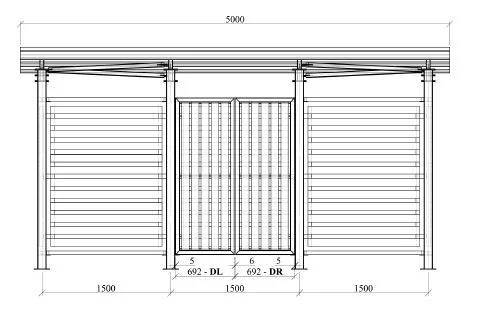 Standartā (esošais attēlos): izmēri 4,5 x 3 m - 4 lielo konteineru izvietošanai; cinkotas metāla daļas; koka daļas krāsotas; divviru durvis ar fiksāciju.